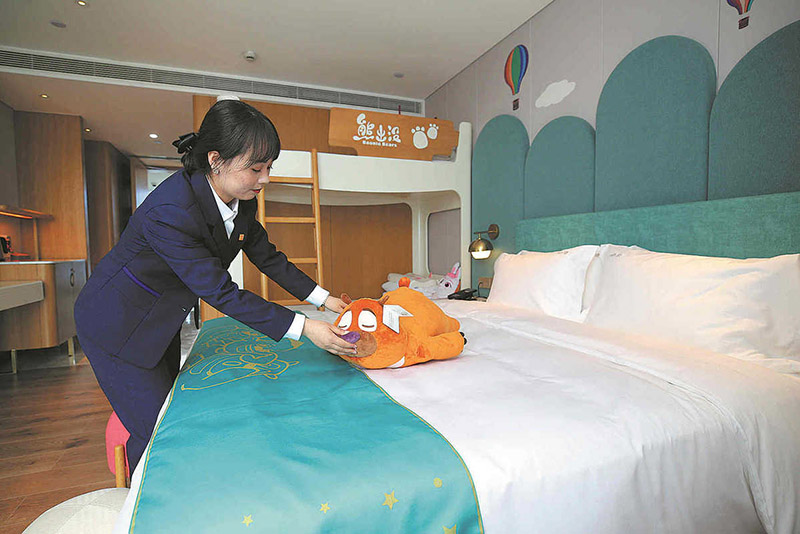 Miembro del personal coloca un juguete en un hotel temático de Boonie Bears que abrió sus puertas en Tianjin en 2021. (Foto: Diario de China)