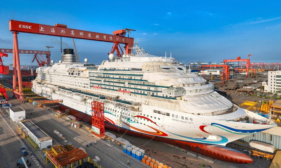 El primer gran crucero construido en China bautizado como "Adora Magic City", también conocido como "Mo Du" en idioma chino, está en proceso de preparativos finales para terminar la flotación del buque, agregando este jueves el agua al muelle de ensamblaje. Está programado para abandonar el muelle el 6 de junio, informó China Media Group.