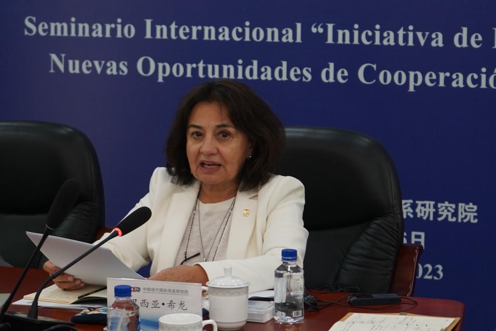 Alicia Girón, coordinadora del Programa Universitario de Estudios sobre Asia y áfrica de la UNAM, habla durante el Seminario Internacional "Iniciativa de Desarrollo Global y Nuevas Oportunidades de Cooperación México-China", celebrado el 6 de junio de 2023 en Beijing, China. (Xinhua/Tian Rui)