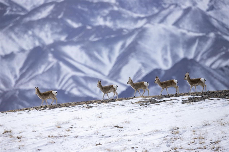 El 31 de diciembre de 2023, grupos de gacelas tibetanas buscan alimento en la meseta de Ha′erteng en Aleiteng, condado autónomo kazajo de Aksai, ciudad de Jiuquan, en la provincia de Gansu. Gao Hongshan/Diario del Pueblo digital