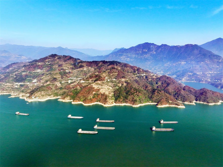 El 3 de enero de 2024, barcos de transporte navegan en las aguas de las Tres Gargantas en el río Yangtze. Wang Huifu/Diario del Pueblo digital