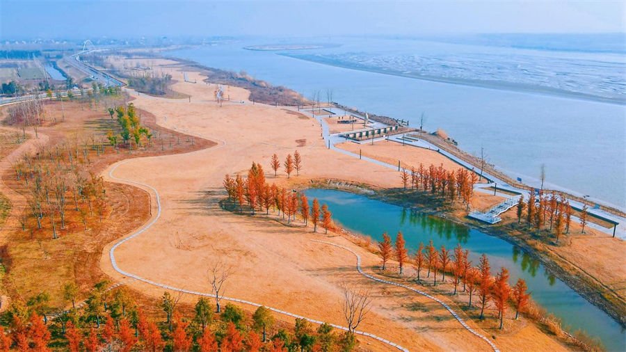 El 4 de enero de 2024, las metasecuoyas de color rojo intenso a lo largo del cinturón de paisaje ecológico de la Bahía de Longyou en Changjiang, ciudad de Rugao, provincia de Jiangsu, rodean las orillas del río, senderos y puentes, presentando un paisaje invernal único. Wu Shujian/Diario del Pueblo digital