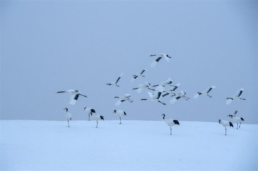 El 4 de enero de 2024, las grullas de coronilla roja juegan con el viento y la nieve en la Reserva Natural de Zhalong, ciudad de Qiqihar, provincia de Heilongjiang. Sun Jianxin/Diario del Pueblo digital