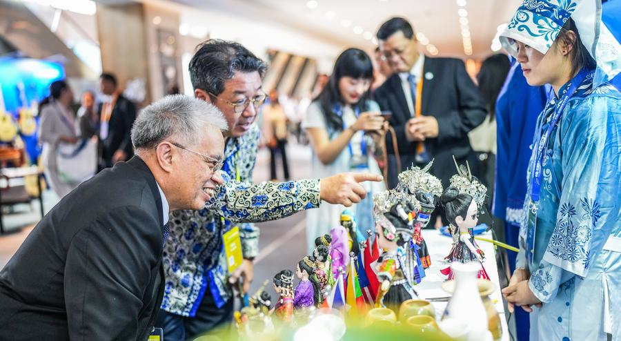 Asistentes observan artefactos durante la Semana de Cooperación de Educación China-ASEAN 2023, en la Nueva área de Gui'an, en la provincia de Guizhou, en el suroeste de China, el 29 de agosto de 2023. (Xinhua/Tao Liang)?