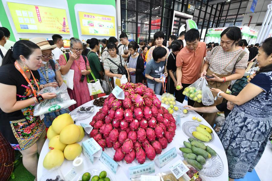 Personas compran frutas durante la 20a Exposición China-ASEAN en el Centro Internacional de Conferencias y Exposiciones de Nanning, en Nanning, capital de la región autónoma de la etnia zhuang de Guangxi, en el sur de China, el 19 de septiembre de 2023. (Xinhua/Huang Xiaobang)