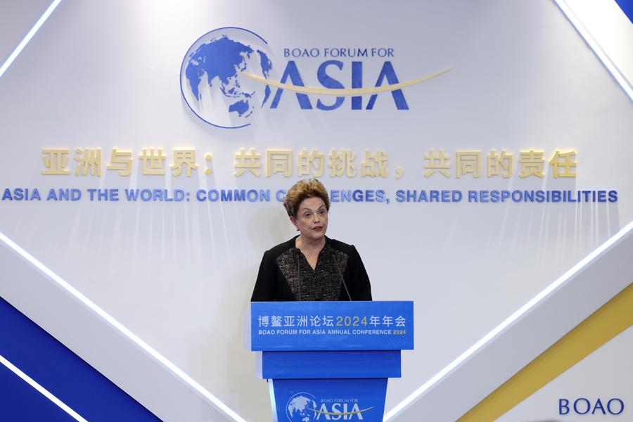 La presidenta del Nuevo Banco de Desarrollo, Dilma Rousseff, durante su intervención en una mesa redonda sobre el tema "Ascenso del Sur Global" en la Conferencia Anual 2024 del Foro Boao para Asia, celebrada en Boao, provincia meridional china de Hainan, el 27 de marzo de 2024. (Xinhua/Tang Rufeng)