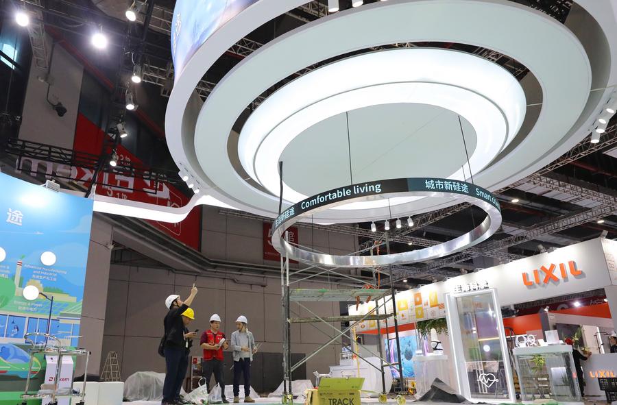 Trabajadores instalan estands de exhibición para la próxima VII Exposición Internacional de Importaciones de China (CIIE, siglas en inglés) en el Centro Nacional de Exposiciones y Convenciones (Shanghai), la sede principal de la CIIE, en Shanghai, en el este de China, el 2 de noviembre de 2024. (Xinhua/Fang Zhe)