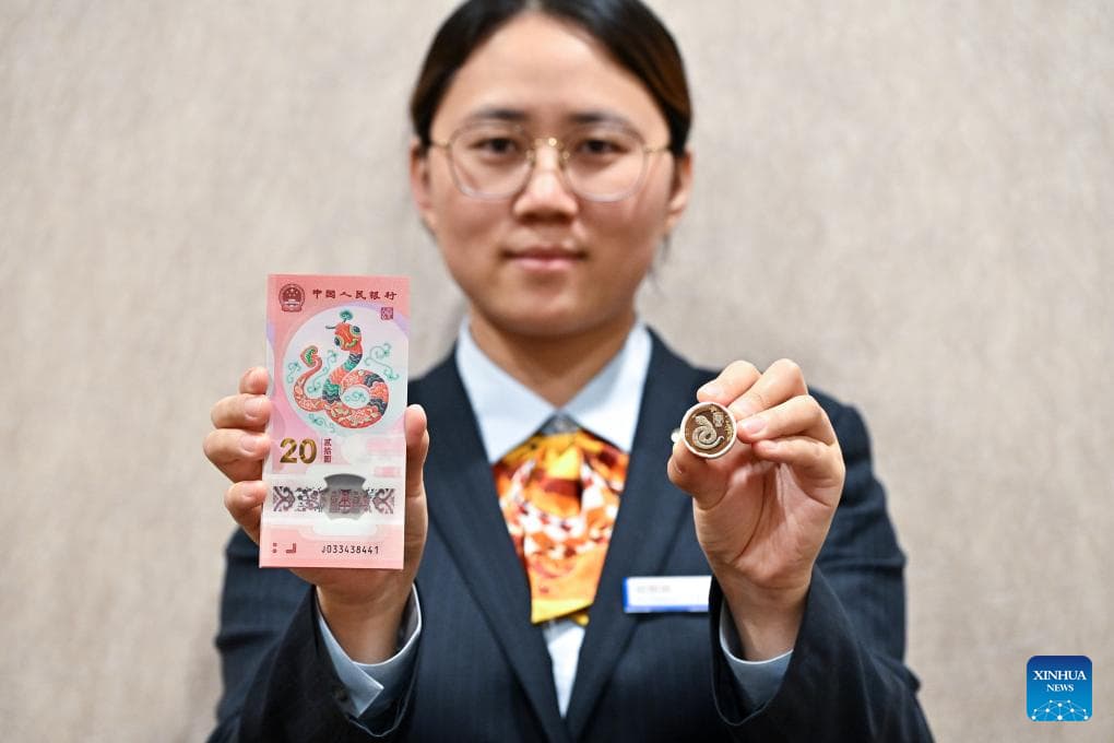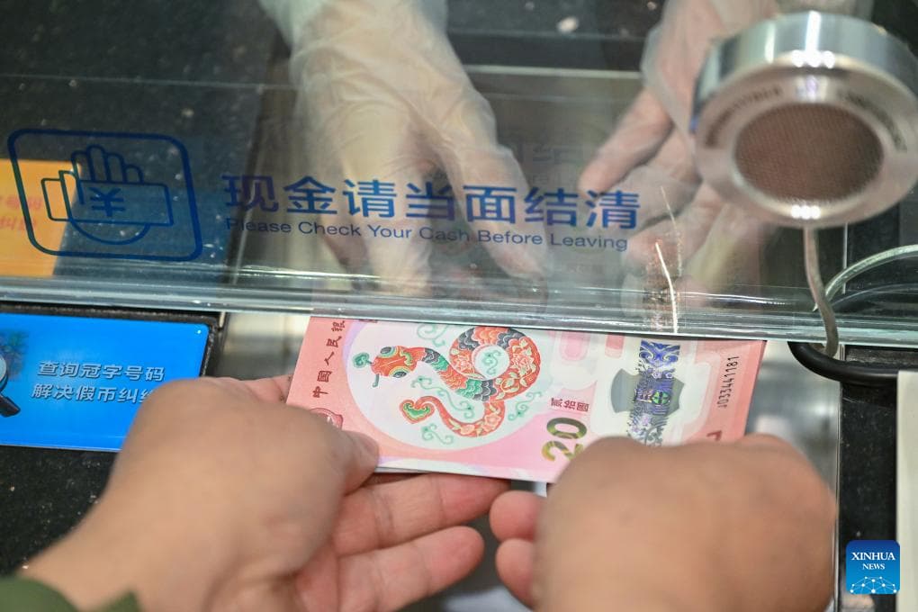 Imagen del 3 de enero de 2025 de billetes conmemorativos emitidos por el banco central de China para celebrar el próximo A?o Nuevo chino. El intercambio de una serie de monedas y billetes conmemorativos emitidos por el banco central de China para celebrar el próximo A?o Nuevo chino comenzó el viernes. (Xinhua/Li Xin)
