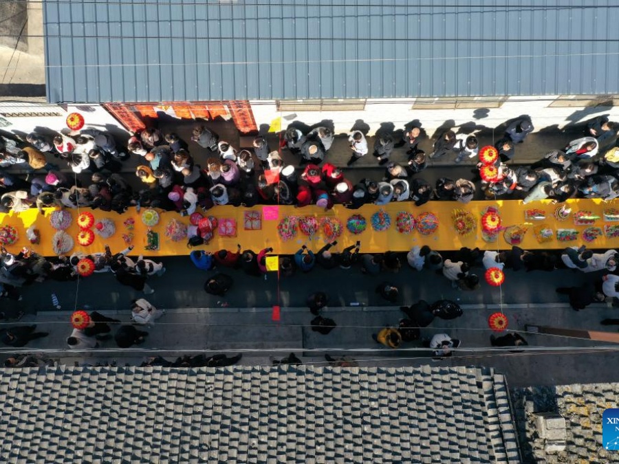Imagen aérea tomada con un dron el 18 de marzo de 2025 de personas observando figuras de pasta, en el poblado de Lancheng del distrito de Lanxian, en la provincia de Shanxi, en el norte de China. La elaboración de figuras de pasta de Lanxian fue declarada patrimonio cultural inmaterial nacional en 2014. Las figuras de pasta pueden ayudar a revivir los recuerdos de la infancia y transmitir buenos deseos para el futuro. (Xinhua/Zhan Yan)