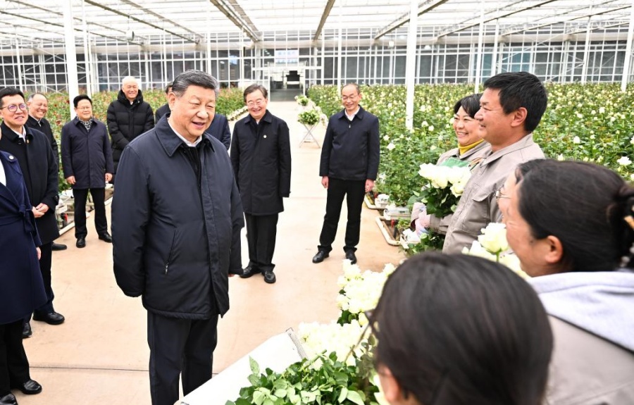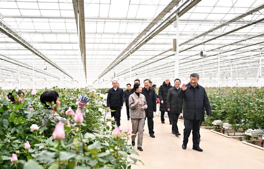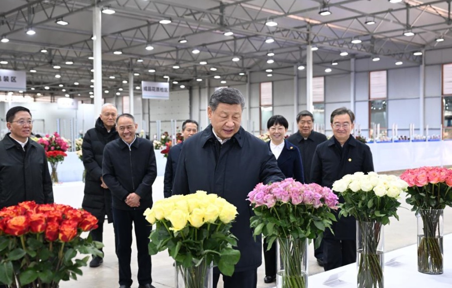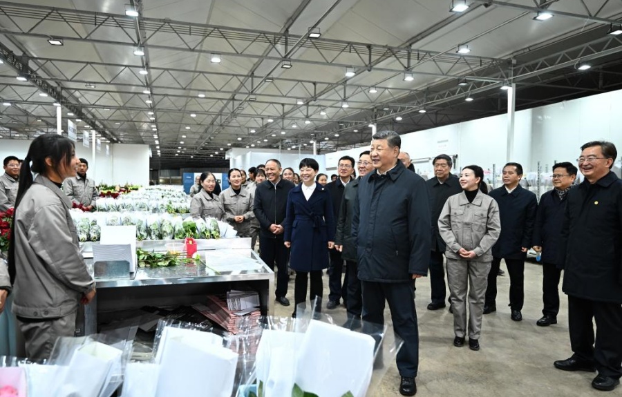 En un centro de exposiciones, Xi conoció variedades de flores recién cortadas. También inspeccionó un área de cultivo de rosas y una línea de producción de clasificación y empaquetado de rosas en el parque.