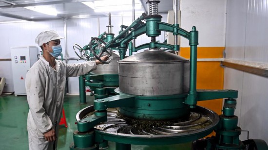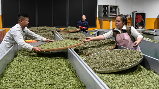 SANJIANG, 23 marzo, 2025 (Xinhua) -- Imagen del 22 de marzo de 2025 de un trabajador procesando hojas de té en una compa?ía de té, en el distrito autónomo dong de Sanjiang, en la región autónoma zhuang de Guangxi, en el sur de China. Después de la Fiesta de la Primavera, cerca de 500 compa?ías de té, cooperativas profesionales, y granjas familiares en Sanjiang aprovechan la temporada dorada para cosechar té de primavera, trabajando para promover el profundo proceso de la producción de té, beneficiando a más de 300.000 personas relacionadas con la industria del té. Sanjiang tiene un área de plantación de té de 215.000 mu (cerca de 14.333 hectáreas) con un valor de producción anual total de 8,7 mil millones de yuanes (aproximadamente 1,2 mil millones de dólares estadounidenses). (Xinhua/Zhang Ailin)