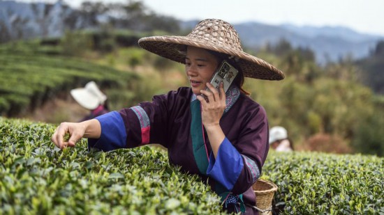 SANJIANG, 23 marzo, 2025 (Xinhua) -- Imagen del 21 de marzo de 2025 de una trabajadora recolectando hojas de té, en una granja de té, en el distrito autónomo dong de Sanjiang, en la región autónoma zhuang de Guangxi, en el sur de China. Después de la Fiesta de la Primavera, cerca de 500 compa?ías de té, cooperativas profesionales, y granjas familiares en Sanjiang aprovechan la temporada dorada para cosechar té de primavera, trabajando para promover el profundo proceso de la producción de té, beneficiando a más de 300.000 personas relacionadas con la industria del té. Sanjiang tiene un área de plantación de té de 215.000 mu (cerca de 14.333 hectáreas) con un valor de producción anual total de 8,7 mil millones de yuanes (aproximadamente 1,2 mil millones de dólares estadounidenses). (Xinhua/Zhang Ailin)