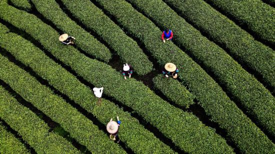 SANJIANG, 23 marzo, 2025 (Xinhua) -- Vista aérea tomada con un dron el 21 de marzo de 2025 de trabajadores recolectando hojas de té, en una granja de té, en el distrito autónomo dong de Sanjiang, en la región autónoma zhuang de Guangxi, en el sur de China. Después de la Fiesta de la Primavera, cerca de 500 compa?ías de té, cooperativas profesionales, y granjas familiares en Sanjiang aprovechan la temporada dorada para cosechar té de primavera, trabajando para promover el profundo proceso de la producción de té, beneficiando a más de 300.000 personas relacionadas con la industria del té. Sanjiang tiene un área de plantación de té de 215.000 mu (cerca de 14.333 hectáreas) con un valor de producción anual total de 8,7 mil millones de yuanes (aproximadamente 1,2 mil millones de dólares estadounidenses). (Xinhua/Zhang Ailin)