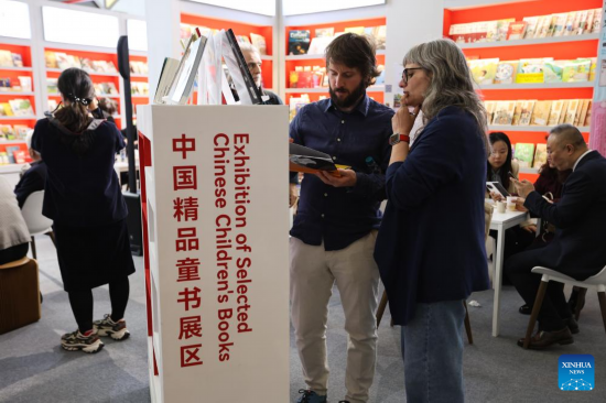BOLONIA, 1 abril, 2025 (Xinhua) -- Personas leen libros en el área de exposición china durante la 62a Feria Internacional del Libro Infantil de Bolonia, en Bolonia, Italia, el 1 de abril de 2025. La feria del libro se inauguró el lunes en la ciudad italiana de Bolonia, y China organizó una serie de eventos para promover su literatura para jóvenes lectores en la escena mundial. (Xinhua/Li Jing)