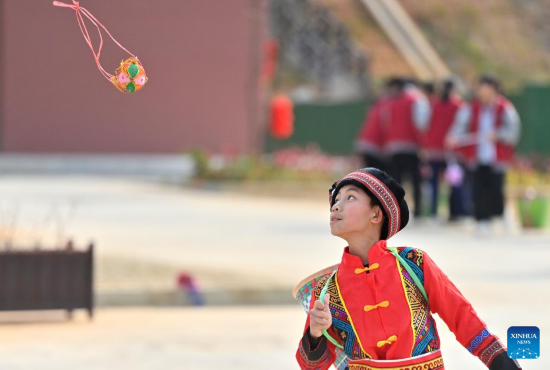 NANNING, 2 abril, 2025 (Xinhua) -- Imagen del 20 de febrero de 2025 de un estudiante atrapando una pelota bordada durante una competencia, en la aldea de Fuwan del distrito de Changzhou, en la ciudad de Wuzhou, en la región autónoma zhuang de Guangxi, en el sur de China. Diversas actividades se han llevado a cabo en escuelas rurales y conjuntos residenciales en Guangxi para promover los patrimonios culturales inmateriales. (Xinhua/Huang Xiaobang)
