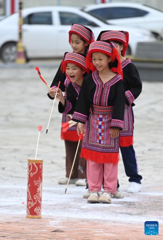 NANNING, 2 abril, 2025 (Xinhua) -- Imagen del 25 de marzo de 2024 de ni?os que portan trajes étnicos jugando al juego Touhu, o "pitch-pot", un antiguo entretenimiento que requiere que los jugadores lancen flechas desde una distancia determinada hacia un recipiente, en la aldea Shanping del distrito de Cangwu, en la región autónoma zhuang de Guangxi, en el sur de China. Diversas actividades se han llevado a cabo en escuelas rurales y conjuntos residenciales en Guangxi para promover los patrimonios culturales inmateriales. (Xinhua/Huang Xiaobang)