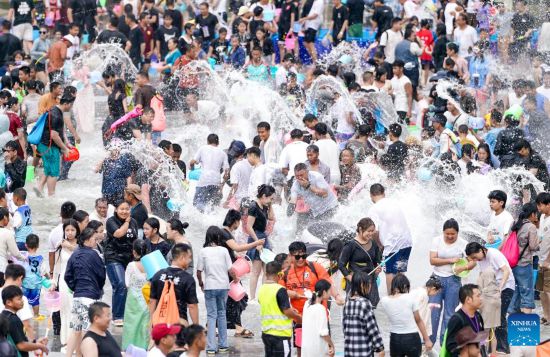 KUNMING, 15 abril, 2025 (Xinhua) -- Turistas y locales celebran el festival de salpicaduras de agua en una plaza, en la ciudad de Jinghong, en la prefectura autónoma de la etnia dai de Xishuangbanna, en la provincia de Yunnan, en el suroeste de China, el 15 de abril de 2025. El festival de salpicaduras de agua es considerado uno de los más importantes de los grupos étnicos del suroeste de China. Durante el festival, el agua se considera un símbolo auspicioso y las personas se salpican unos a otros, deseándose así felicidad y buena fortuna. (Xinhua/Gao Yongwei)