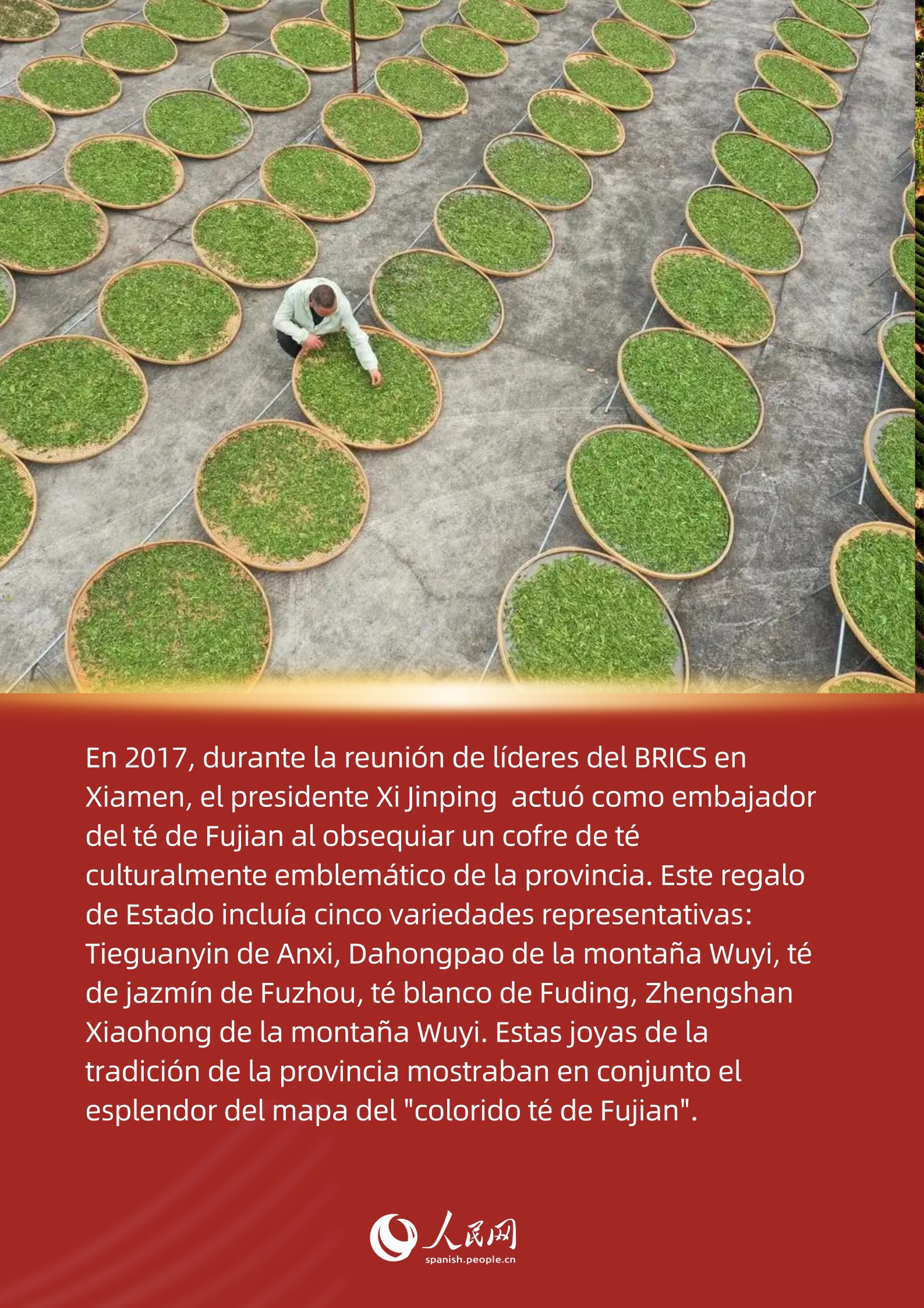 En 2017, durante la reunión de líderes del BRICS en Xiamen, el presidente Xi Jinping actuó como embajador del té de Fujian al obsequiar un cofre de té culturalmente emblemático de la provincia. Este regalo de Estado incluía cinco variedades representativas: Tieguanyin de Anxi, Dahongpao de la monta?a Wuyi, té de jazmín de Fuzhou, té blanco de Fuding, Zhengshan Xiaohong de la monta?a Wuyi. Estas joyas de la tradición de la provincia mostraban en conjunto el esplendor del mapa del "colorido té de Fujian".