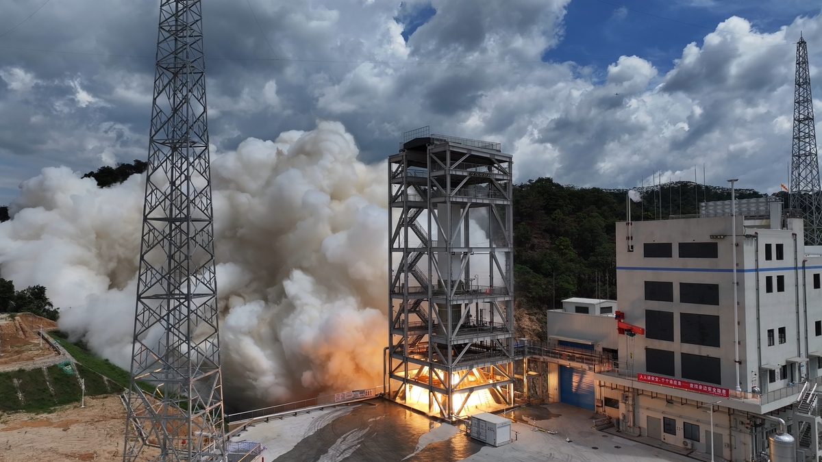 CAS Space lleva a cabo una prueba en tierra en su complejo de pruebas de motores a propulsión líquida en un suburbio monta?oso de Guangzhou, provincia de Guangdong, 11 de junio del 2025. [Foto: proporcionada a chinadaily.com.cn]