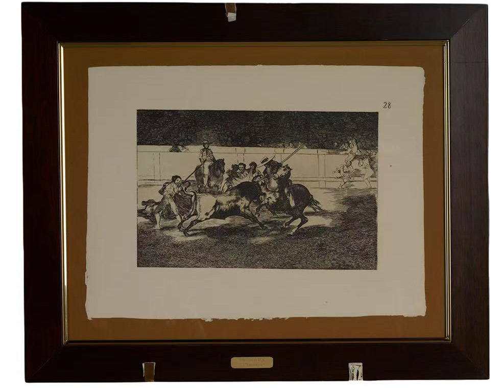 El último regalo que quiero presentarte proviene de mi patria, Espa?a. Esta es un grabado, en blanco y negro, obsequiado por Espa?a a China en 1985, que muestra la tradicional corrida de toros. Desde el 19 de marzo, Día de San Jos, hasta el 12 de octubre, Día Nacional de Espa?a, la temporada dura siete meses.
