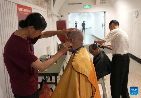 HANGZHOU, 1 julio, 2025 (Xinhua) -- Voluntarios ofrecen servicios gratuitos de corte de cabello en un refugio antiaéreo, en Hangzhou, en la provincia de Zhejiang, en el este de China, el 1 de julio de 2025. Un total de 6 refugios antiaéreos fueron abiertos al público el martes, ofreciendo a los residentes alivio del clima caluroso. Este servicio de dos meses es una tradición de 20 a?os en la ciudad. (Xinhua/Han Chuanhao)
