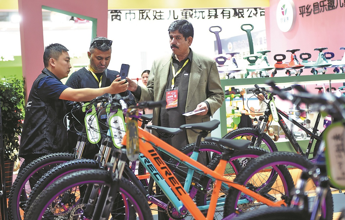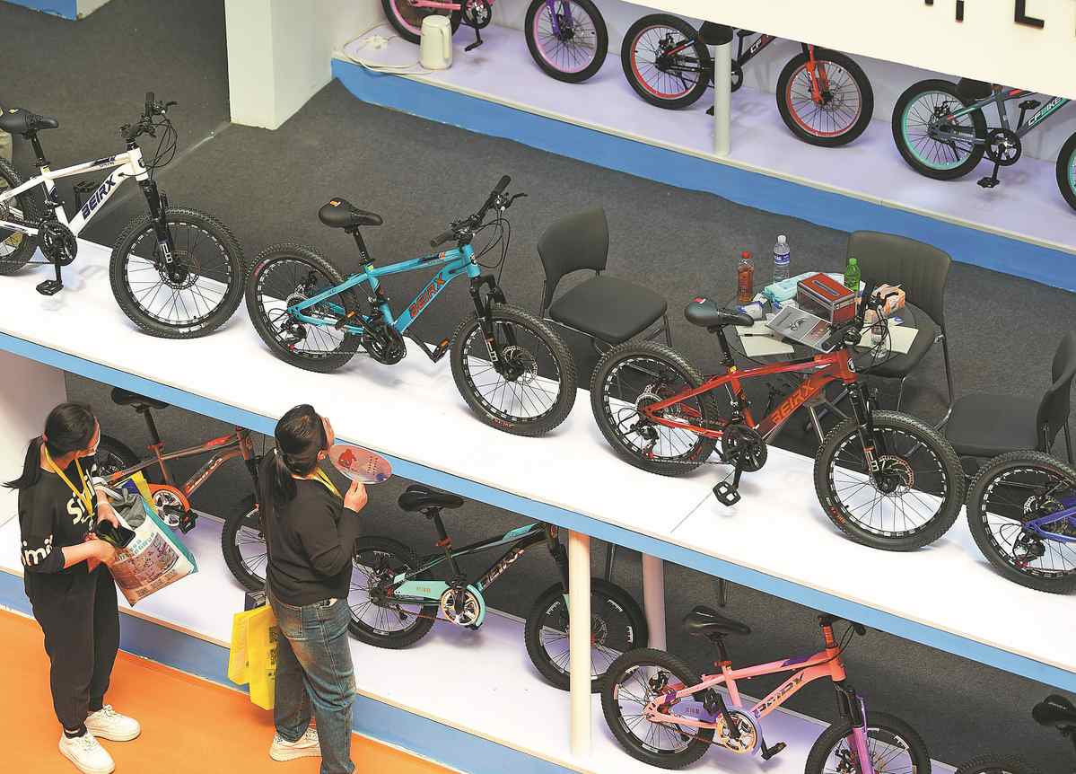 Un empresario extranjero visita la 17a Feria Internacional de Bicicletas, Carretas y Juguetes en el condado Pingxiang, provincia de Hebei, el 12 de abril de 2024. ZHAO YONGHUI/PARA CHINA DAILY