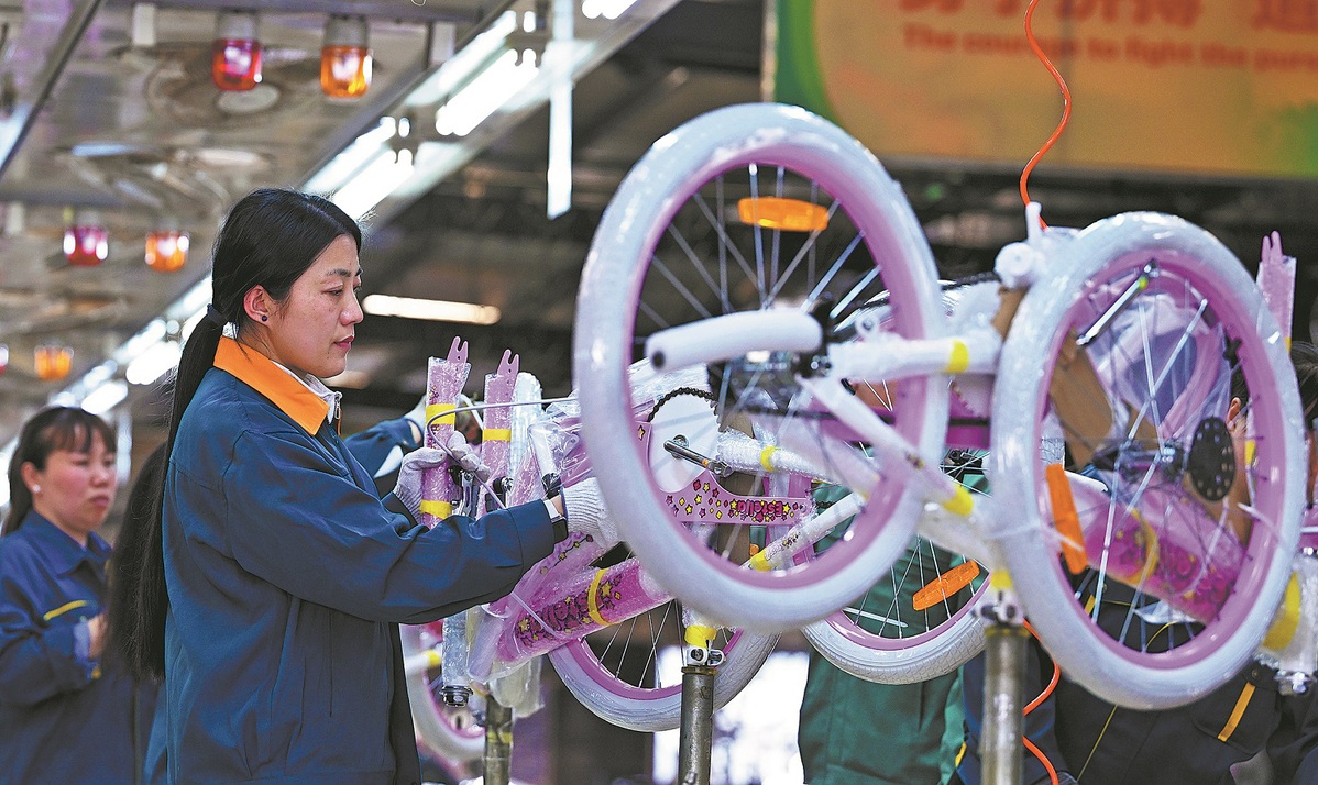Los trabajadores de una planta de fabricación de bicicletas se apresuran a producir cochecitos para la exportación el 14 de abril de 2025, en el condado Pingxiang, provincia de Hebei. ZHAO YONGHUI/PARA CHINA DAILY