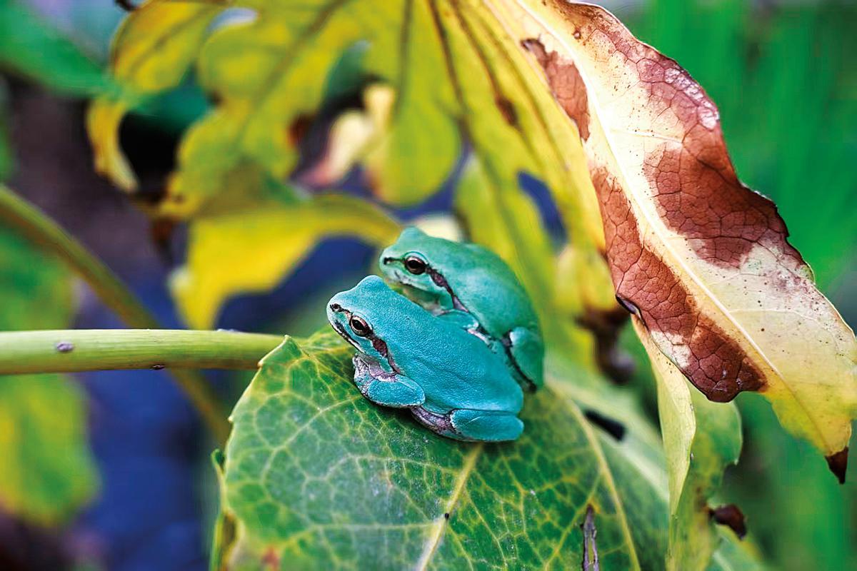 Par de ranas arbóreas sin manchas descansan sobre una hoja en una zona experimental de Shanghai, junio del 2025. [Foto: proporcionada a China Daily]