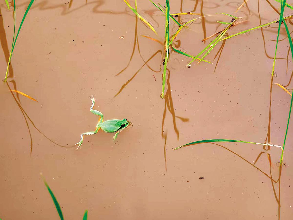 Una rana de campo nada en un estanque de arroz en una zona experimental, mayo del 2025. [Foto: proporcionada a China Daily]