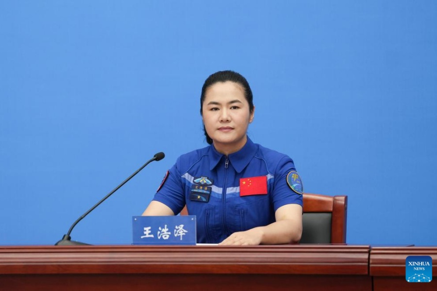 La astronauta Wang Haoze de la misión tripulada Shenzhou-19 de China es visto durante una conferencia de prensa, en Beijing, capital de China, el 9 de julio de 2025. Los astronautas Cai Xuzhe, Song Lingdong y Wang Haoze de la misión tripulada Shenzhou-19 de China se reunieron el miércoles con la prensa, en su primera aparición pública tras regresar a la Tierra en abril. (Xinhua/Li Yanchen)