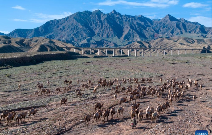 Vista aérea tomada con un dron el 26 de julio de 2025 de camellos en su viaje migratorio de verano, en el distrito autónomo kazajo de Aksay, en la provincia de Gansu, en el noroeste de China. Los pastores de la aldea Jia'erwuzong de Aksay trasladan sus camellos a los pastos de verano de Qilian cada verano, lo que permite que las praderas se rejuvenezcan y garantiza la sostenibilidad de la cría de animales. (Xinhua/Gao Hongshan)