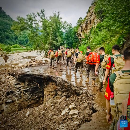 BEIJING, 29 julio, 2025 (Xinhua) -- Imagen tomada con un teléfono móvil el 28 de julio de 2025 de miembros de la Fuerza de Policía Armada Popular (FPAP) de China transportando suministros al poblado de Liulimiao del distrito de Huairou, en Beijing, capital de China. El Ejército Popular de Liberación de China, la FPAP y las milicias locales han desplegado tropas para unirse a los esfuerzos de alivio y socorro en las zonas afectadas por inundaciones en el país. (Xinhua/Yan Tongshuai)