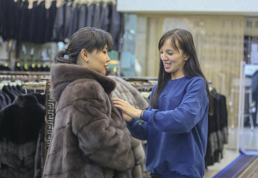 Imagen de archivo del 12 de junio de 2019 de una comerciante de Kazajistán ayudando a una clienta a probarse prendas de vestir en el Centro Internacional de Cooperación Fronteriza China-Kazajistán de Horgos, en Horgos, en la región autónoma uygur de Xinjiang, en el noroeste de China. (Xinhua/Zhou Xu)