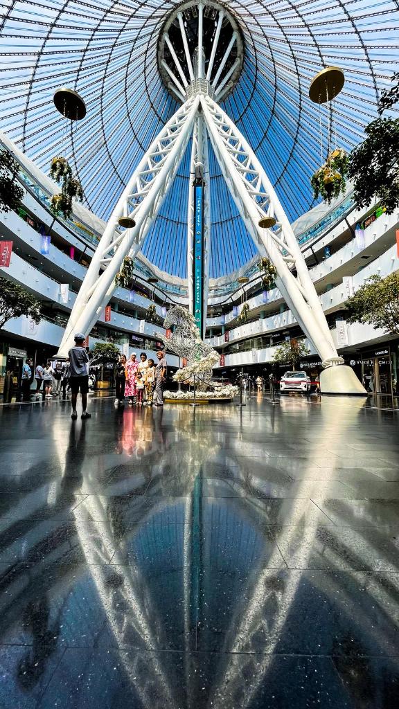 Imagen tomada con un teléfono móvil el 29 de junio de 2024 de personas posando para fotografías en el centro comercial de Khan Shatyr, en Astaná, Kazajistán. (Xinhua/Bai Xueqi)