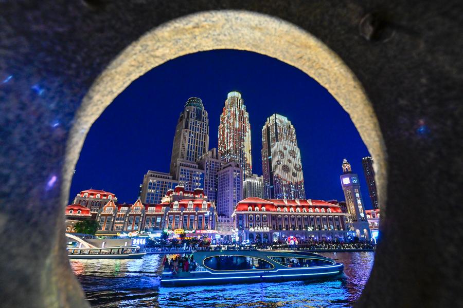 Imagen del 25 de agosto de 2025 de personas tomando botes para disfrutar de la vista nocturna del río Haihe, en Tianjin, en el norte de China. (Xinhua/Du Penghui)