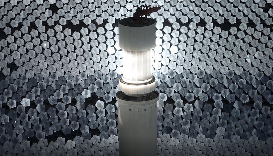 A medida que el sol se eleva sobre las laderas orientales de las monta?as Tianshan, más de 14.500 heliostatos pentagonales están dispuestos en círculos concéntricos alrededor de una torre solar.