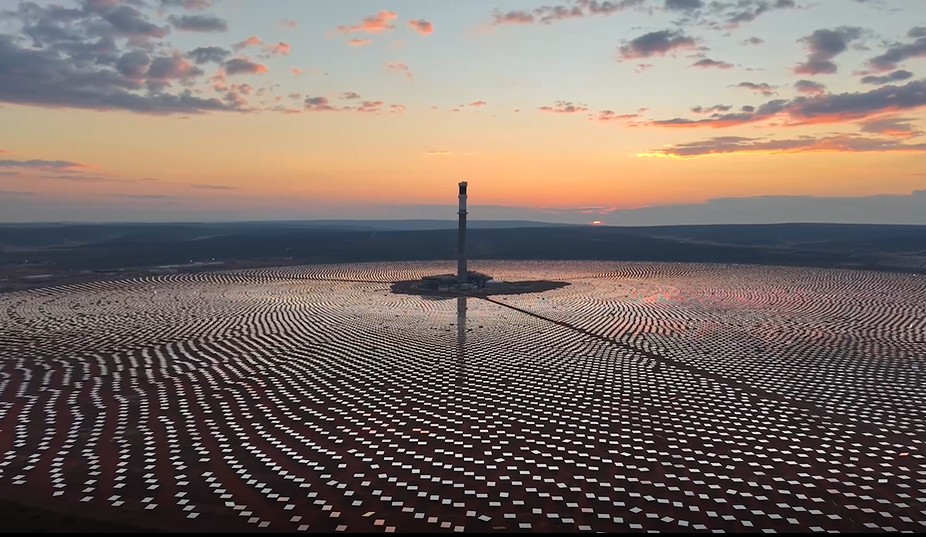 Miles de heliostatos enfocan la luz solar sobre un receptor en la parte superior de una torre, calentando sal fundida en su interior. La sal fundida caliente luego produce vapor al calentar agua, lo que impulsa turbinas para generar electricidad de manera continua.