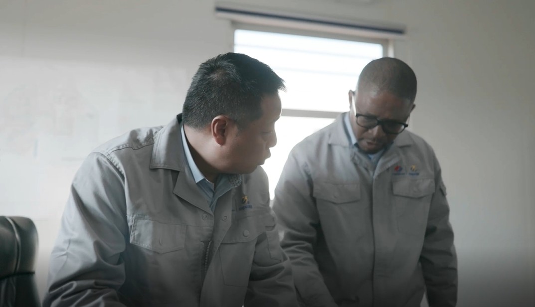 Los miembros del personal chinos y sudafricanos trabajan juntos en el proyecto de energía solar térmica concentrada de 100 MW Redstone en Postmasburg, provincia del Cabo del Norte, Sudáfrica. (Foto: Kgothatso Mogashoa)
