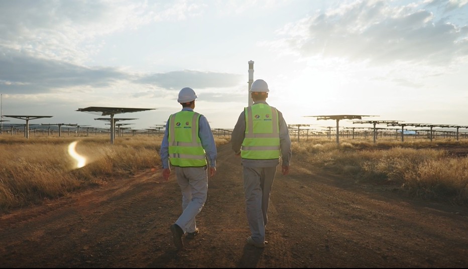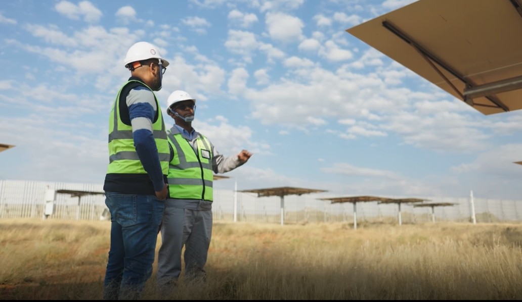 Clayton Raad, supervisor de la división mecánica del proyecto, y Mthoko Ngidi, director adjunto del proyecto, inspeccionan heliostatos en el Proyecto de Energía Solar Térmica Concentrada de 100 MW Redstone en Postmasburg, Provincia del Cabo del Norte, Sudáfrica. (Foto: Kgothatso Mogashoa)