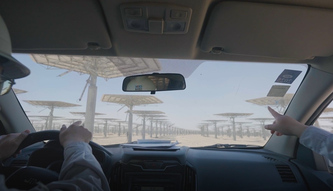Los miembros del personal conducen entre filas de heliostatos mientras realizan operaciones en la planta de energía solar térmica de torre de sal fundida de 50 megavatios en el condado de Yiwu, Hami, en la región autónoma uygur de Xinjiang, en el noroeste de China. (Foto: Diario del Pueblo digital/ Yuan Meng)
