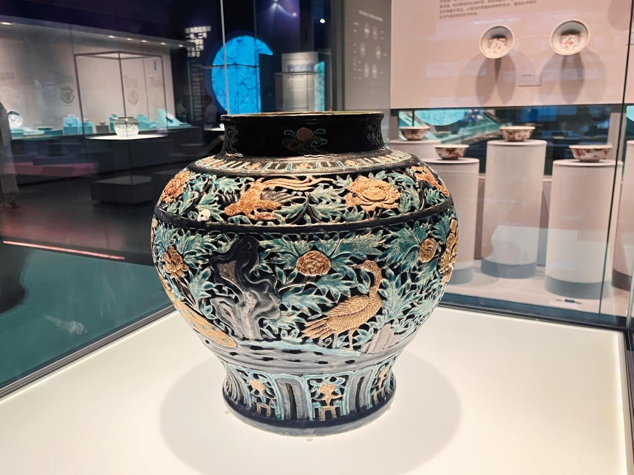 En el interior de la galería, una gran jarra Fahua dorada, adornada con motivos de pavo real y peonía en dise?os calados, se yergue con una magnificencia serena. Su brillante vidriado, su intrincado enrejado y su exquisito dorado cautivan la mirada. Sin embargo, tan solo el a?o pasado, esta obra maestra aún yacía intacta en el lecho marino, a unos 1.500 metros de profundidad, junto a más de 100.000 piezas de porcelana y troncos de ébano.