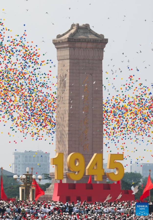 China concluyó hoy miércoles el acto conmemorativo por el Día de la Victoria liberando 80.000 palomas y lanzando al cielo 80.000 globos sobre la Plaza Tian'anmen, en el centro de Beijing.