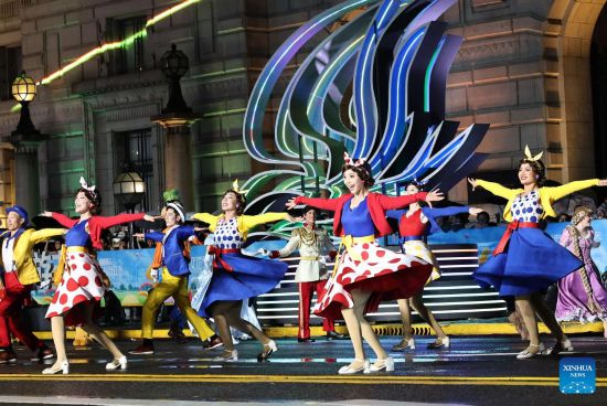 SHANGHAI, 14 septiembre, 2025 (Xinhua) -- Imagen del 13 de septiembre de 2025 de una compa?ía artística de Shanghai Disneyland Resort realizando una presentación durante el desfile de carrozas del Festival de Turismo de Shanghai, en Shanghai, en el este de China. La ceremonia de inauguración del 36 desfile de carrozas del Festival de Turismo de Shanghai se celebró el sábado en el distrito de Huangpu de Shanghai. Un total de 25 carrozas y 24 equipos artísticos de 15 países y regiones participaron en el desfile. (Xinhua/Fang Zhe)