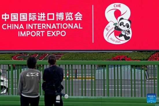 Imagen del 29 de octubre de 2025 de un logotipo de la 8a Exposición Internacional de Importaciones de China (CIIE, por sus siglas en inglés) cerca del Centro Nacional de Exposiciones y Convenciones (Shanghai), en Shanghai, en el este de China. Los preparativos están en pleno apogeo para la CIIE, que se celebrará del 5 al 10 de noviembre en Shanghai. (Xinhua/Liu Ying)