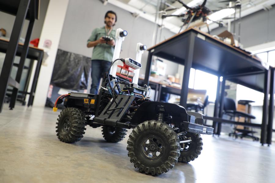 Imagen del 19 de noviembre de 2025 del doctor, Rodolfo Vera Amaro, de la Unidad Profesional Interdisciplinaria en Ingeniería y Tecnologías Avanzadas del Instituto Politécnico Nacional (IPN) de México, realizando pruebas con un vehículo robótico (rover), en la Ciudad de México, capital de México. (Xinhua/Francisco Ca?edo)