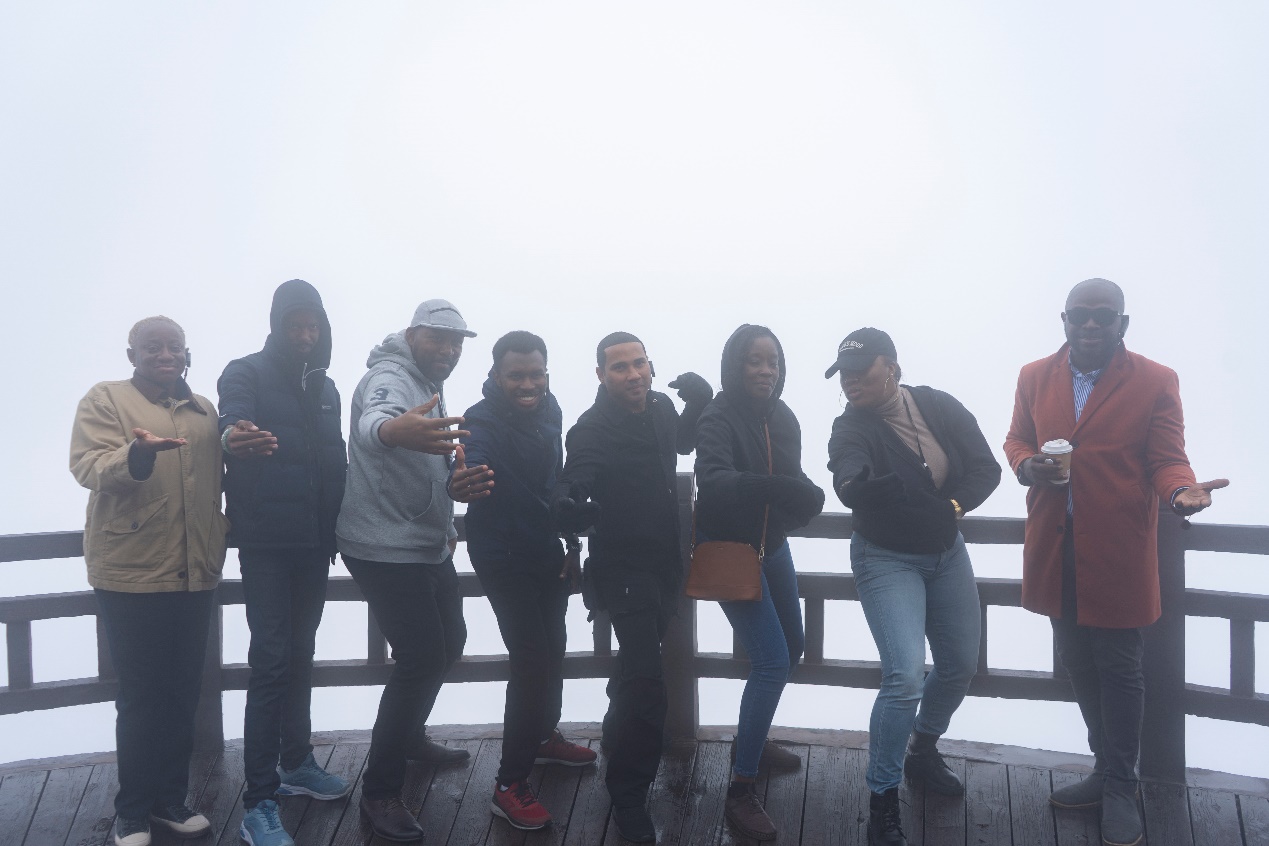 Periodistas extranjeros posan para una foto en la cima de la zona escénica de la monta?a Yuntai de Haishang, en Lianyungang, provincia oriental china de Jiangsu, el 22 de octubre de 2024.…