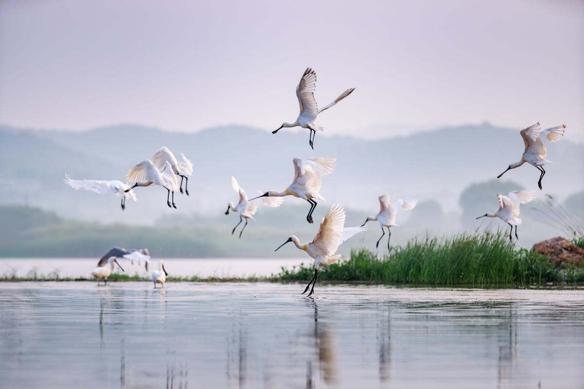 Espátulas de cara negra animan un emblemático embalse en Dalian