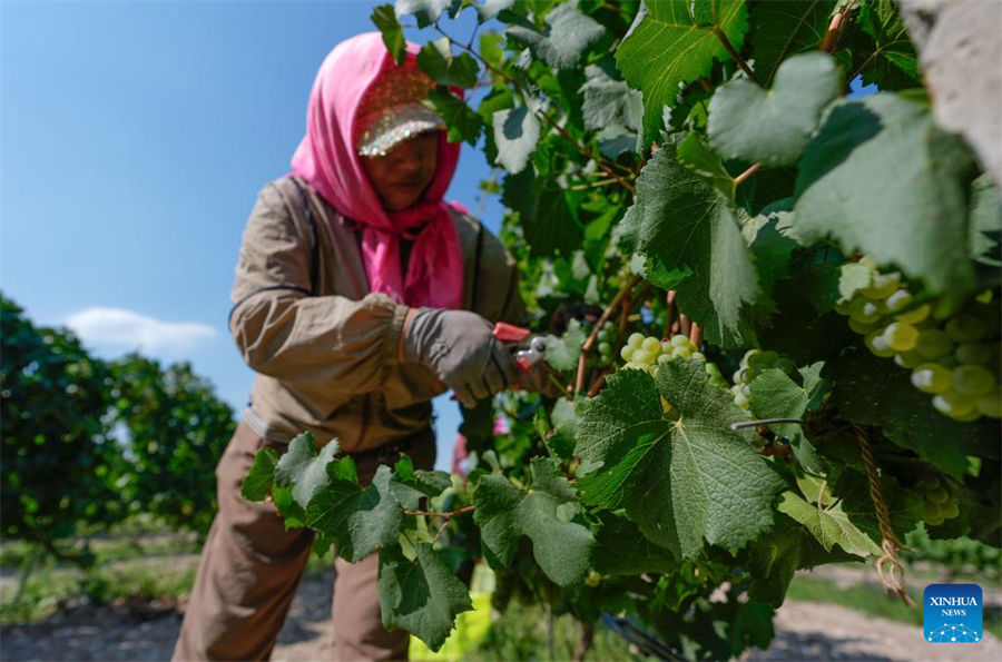 Imagen del 12 de agosto de 2024 de una trabajadora cosechando uvas de vino blanco en un vi?edo al pie oriental de la monta?a Helan, en la región autónoma de la etnia hui de Ningxia, en el noroeste de China.…