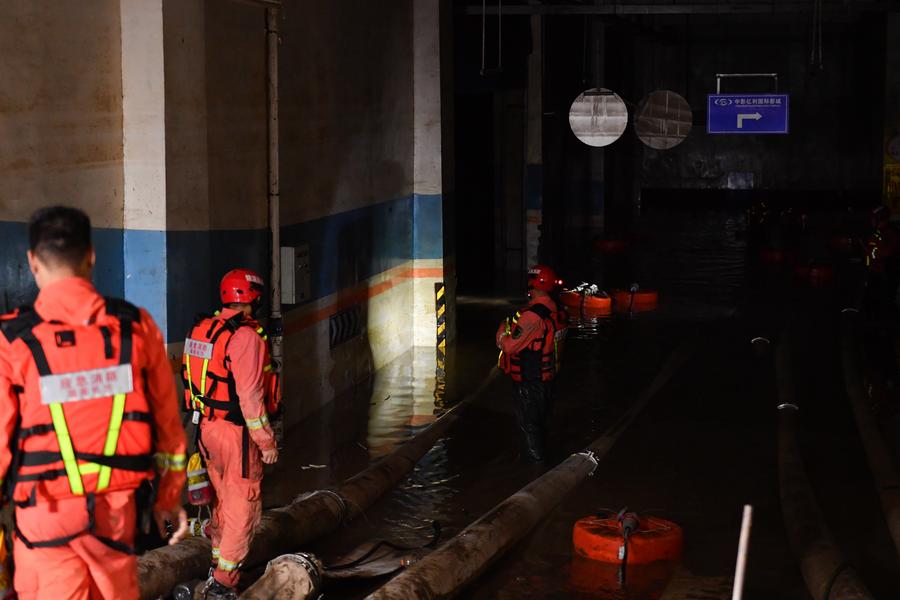 Bomberos drenan el agua en un garaje subterráneo de un complejo residencial, en el distrito de Longshan, en la provincia de Hunan, en el centro de China, el 20 de junio de 2025.…