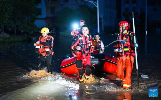 HUAIJI, 19 junio, 2025 (Xinhua) -- Imagen del 18 de junio de 2025 de bomberos transladando a residentes afectados por la inundación, en el distrito de Huaiji, en la provincia de Guangdong, en el sur de China.…
